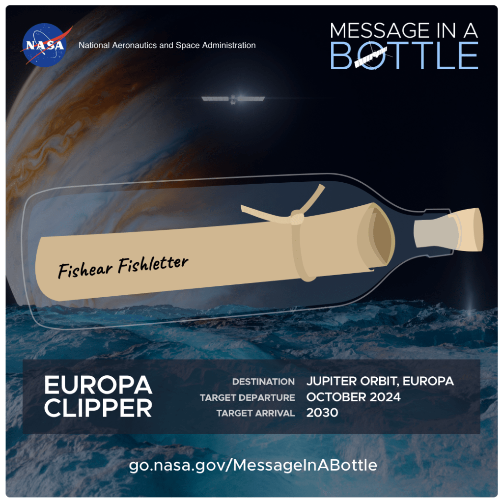 根據宇宙漂流瓶活動的信息,載有每個填寫人名字的芯片,抵達木星區域後,將會環繞木星的天然衛星(傳說中神奇的木衛二)歐羅巴(EUROPA)約50圈,最近處將距離木衛二表面25公里,目的就是為了探測這顆衛星是否有支持生命存在的區域。人類之前已經觀測到,木衛二上存在著冰凍的海洋!海洋冰面之下不知道會有甚麼!而它有可能是太陽系中除地球外人類最宜居的地點,在那裡,探測器說不定真會遇見外星生命,外星飛船,甚至外星人!想一想就很興奮不是嗎?所以,《魚書》的讀者朋友,你們要不要也去網站填寫你們的名字,和《魚書》一起出發去遠方?