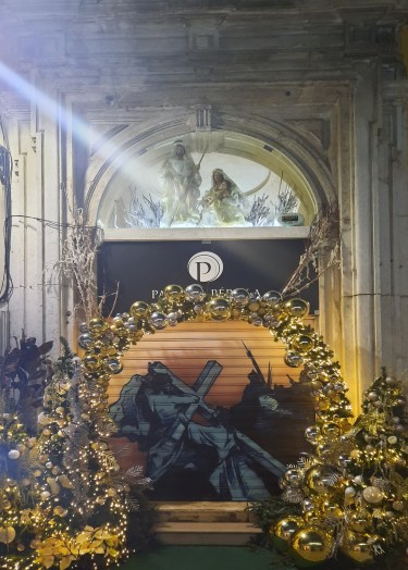 在葡萄牙,國家權力介入的公共場所,我看了聖誕節宗教裝飾的曖昧化,宗教裝飾以聖誕老人為偶像代表的邊緣性試探。而在商業和街頭藝術區域,我也看到了天主教信仰的強烈表達。以下是Sétubal地標商業街上的金匠商店Paço da Pérola 的聖誕裝飾,這裡賣一些奢侈首飾。你們看,門上都是耶穌背十字架的圖像,我覺得在法國這個國家,要是Dior敢這麼幹(雖然Dior是私人品牌)那大概要關門了⋯⋯(此處不是魚書Dior廣告,不過它要看到請打錢)
