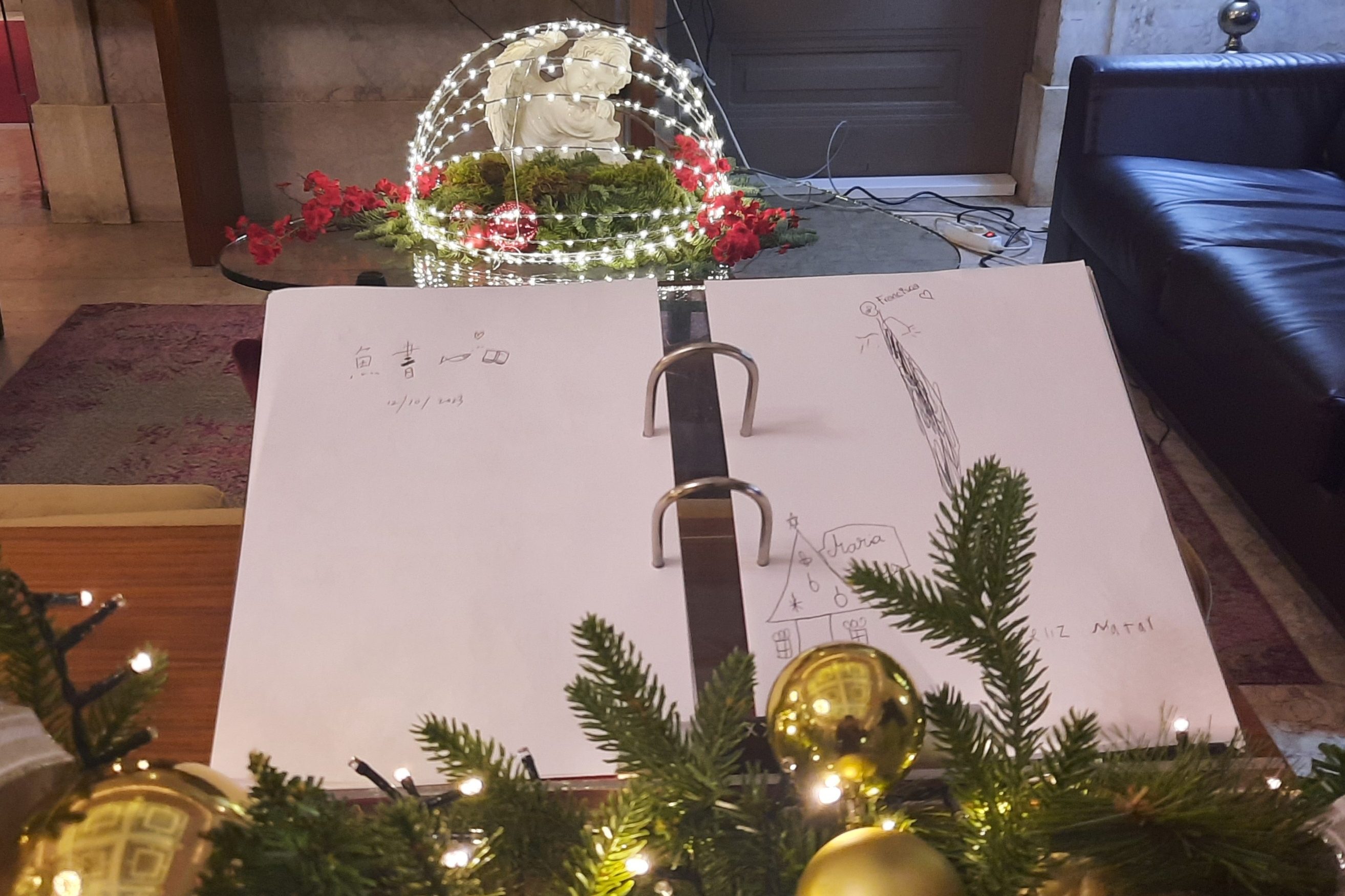 不但如此,小城政府還引以為傲,特別願意分享自己的聖誕裝飾佈置,甚至都擺上了精緻而優雅的到此一遊簽名本。看到這場景,瘋癲的本魚怎麼能不手癢?於是,在這個城市市政廳的聖誕歷史上,就有了戀愛腦的🐟📖標誌⋯⋯