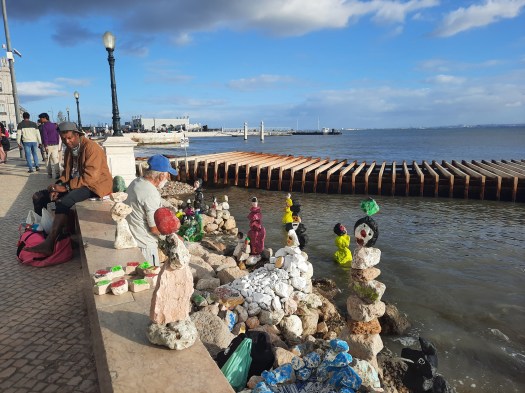 而在里斯本,街頭藝術家也在地標建築河邊用石頭壘起來耶穌誕生群像。白色的為聖母瑪利亞。相比起來,感覺法國街頭藝術家好像大都在公共地標場所以藝術為媒介罵政治或者罵人⋯⋯