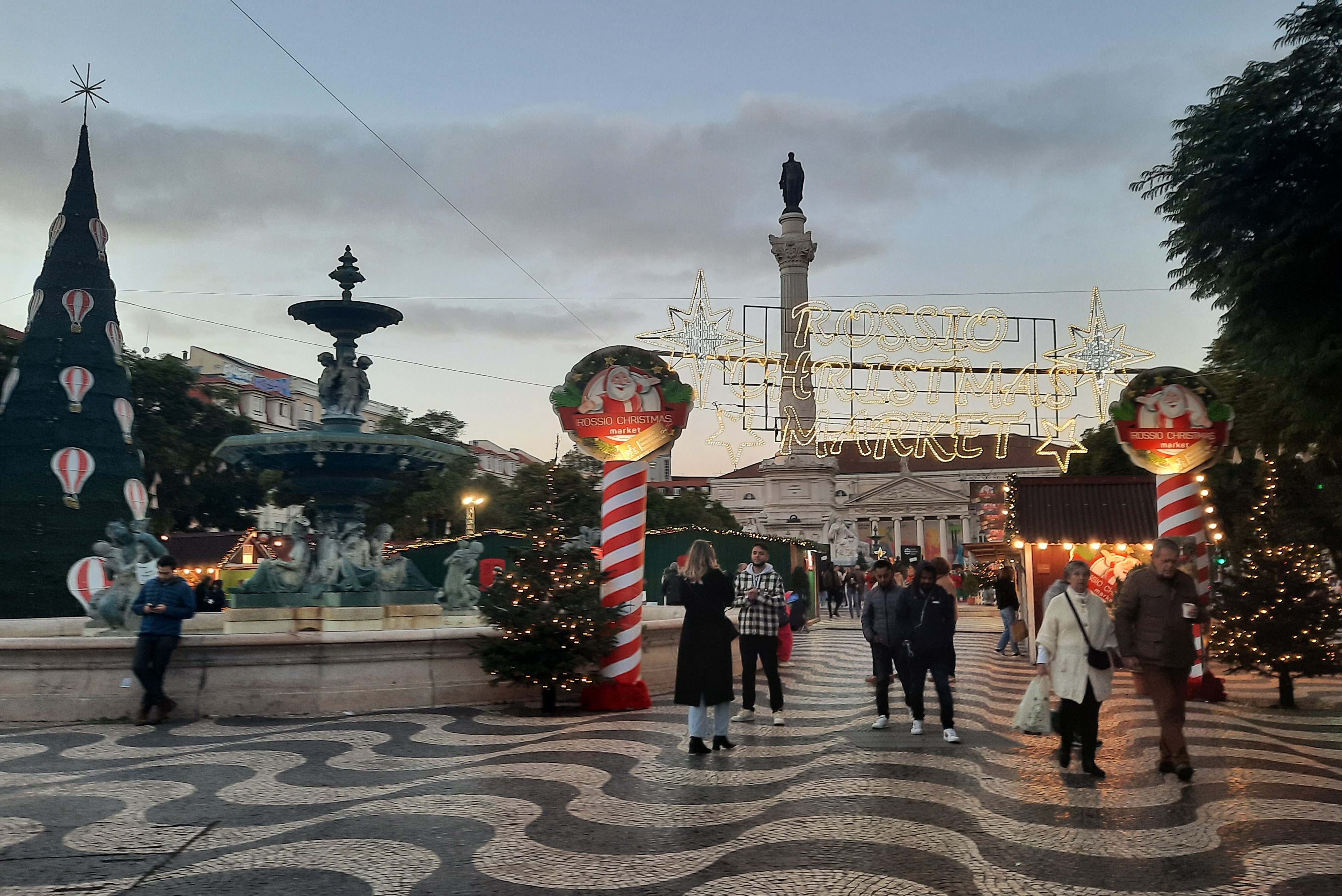 下面我們去看聖誕集市。下圖是今年位於里斯本唐佩德羅四世廣場(Praça Dom Pedro IV)的聖誕集市。葡萄牙這個國家在裝飾公共地面上貌似花費巨資,不論大城小鎮,都有石塊拼起來的地面。工匠們善於用黑色和米色的石塊在公共場所用地拼出不同的圖案,甚至是非常複雜的畫面。它讓我想起博物館中的古羅馬馬賽克地面,一直以為都是古蹟,可後來發現就連過街的黑白人行道也由黑白石塊拼接而成(不是畫上去的!),同時亦親眼見到工匠正用石塊手工舖人行道,於是釋然,這應是葡萄牙人公共場所美感執念所在。