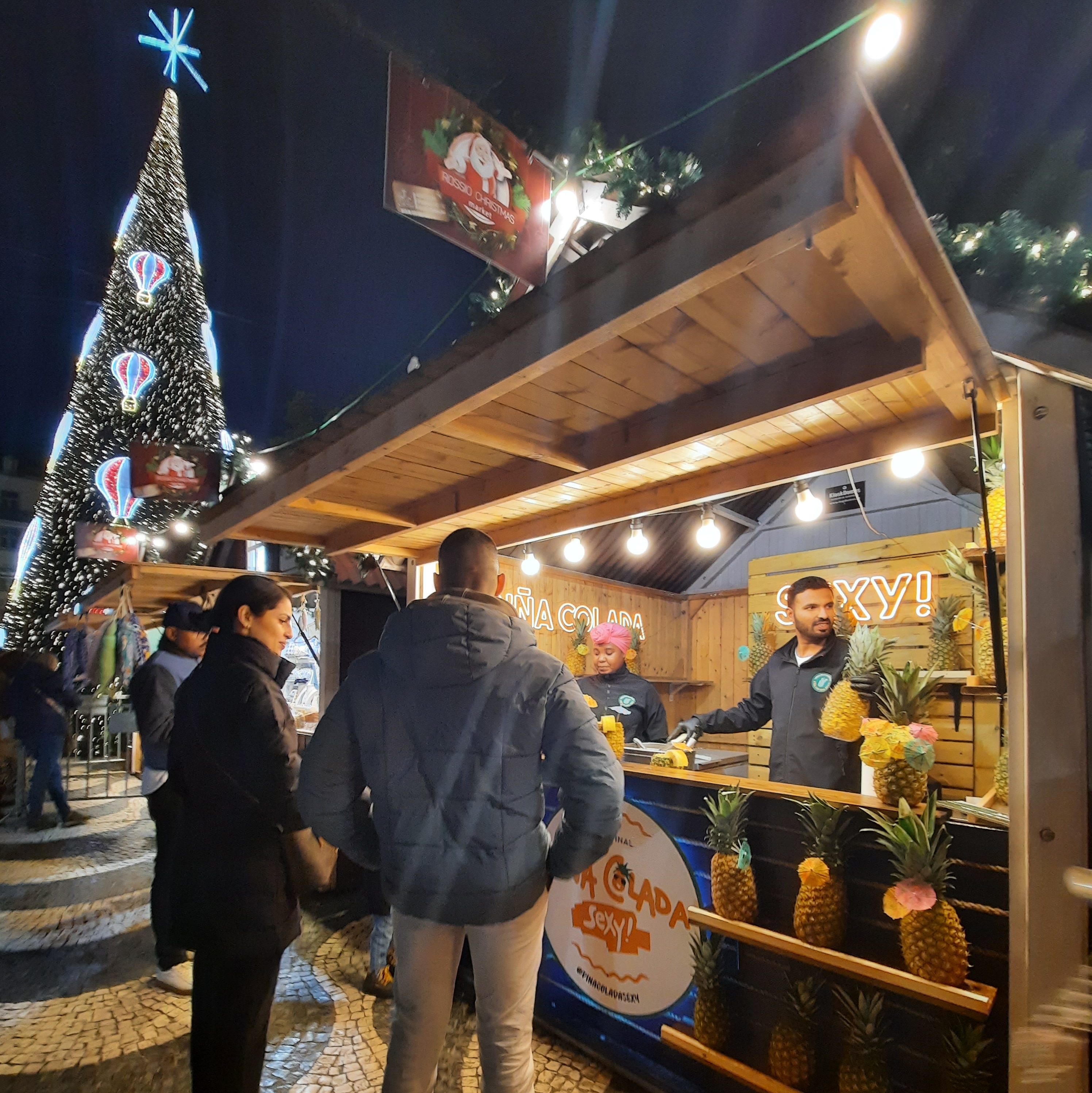 整個廣場上飄散著肉桂蘋果橙子紅酒的香氣和火腿奶酪三明治的味道。除此之外,這裡的人還喝一種熱櫻桃酒,以及菠蘿雞尾酒。熱紅酒在歐洲北部寒冷的地區,是聖誕集市的必備,可以暖身。但是里斯本十二月份溫度在十六七度左右,太陽出來時甚至可以穿短袖,所以水果啤酒很受歡迎。我不知道這是近年葡萄牙的新事物還是傳統特產,在里斯本大街上走,居然碰到好幾個菠蘿雞尾酒流動攤位,都是拿一整個菠蘿做容器,將果肉打碎和啤酒混合在一起。不過葡萄牙這個國家,人們好像對菠蘿和甜瓜獨有情種,在餐館裡總能看見這兩種東西擺在冷箱裡,有時候會做開胃菜品⋯⋯好吧,本來帶你逛聖誕集市談政教分離和神聖世俗的我,怎麼跑題去聊吃喝了。