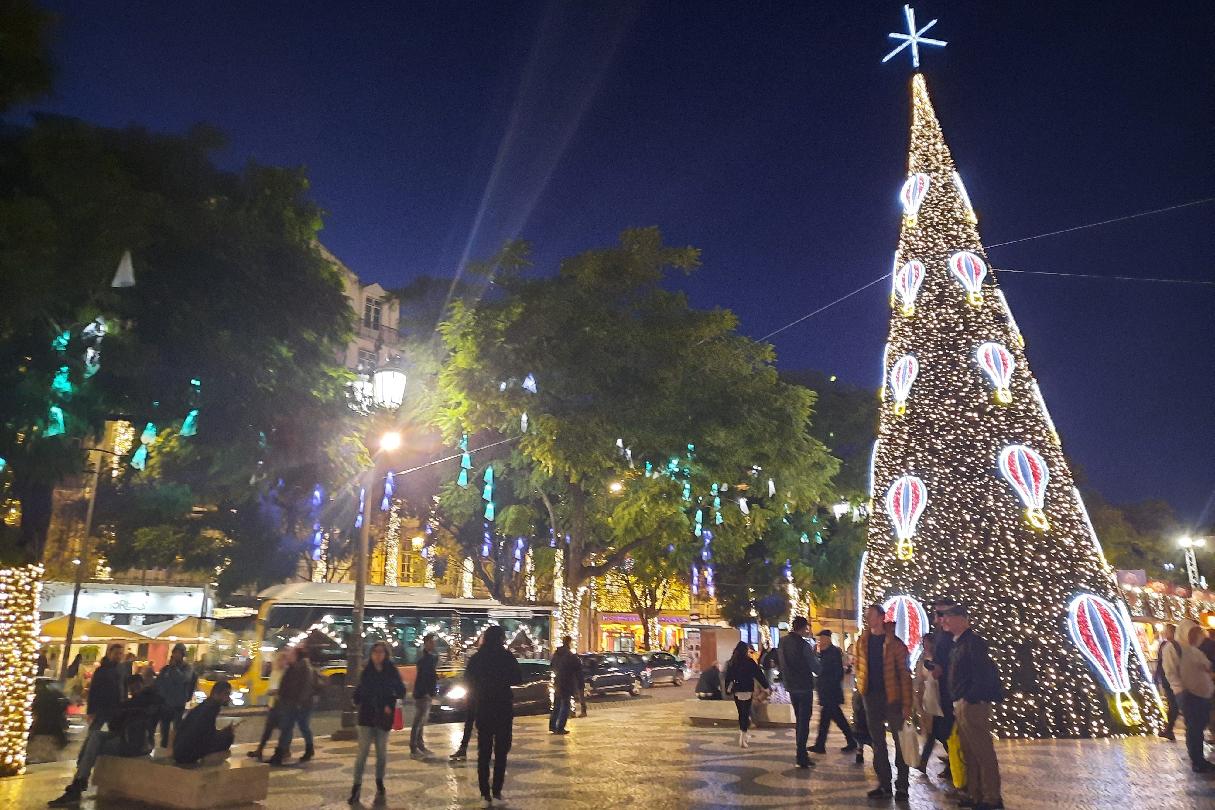 在里斯本聖誕集市上,人們最先看到的裝飾是聖誕樹,旁邊不少人在拍照。