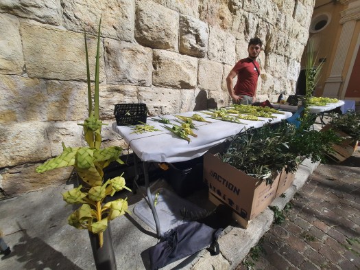 上圖這個攤點,這些棕櫚葉製品都是手工編成,越大的,結越多的越貴,最貴的差不多40歐,最便宜的是十字架,1歐,其餘的3歐,5歐不等。這些攤位還賣橄欖樹枝。當我問起這位小哥這些圖像都象徵著什麼時,小哥說除了十字架外都沒什麼象徵意義,就是家裡人這樣流傳下來的編制方式,其實是一種藝術品。這些棕櫚葉編制的手工藝品買回去放在家裡,會一直保持原樣,顏色也不會變化,可以放很久,但是當地人一般在下一年棕枝主日前夜燒掉。小哥隨口說出了2025年復活節的日期,這讓我很驚訝,好像這個日期,是小哥融入血液倒背如流的一個時間。他還說,這條街上賣棕櫚樹手工藝品的所有攤點都是他家人的。他隨手指著,靠教堂處是他妹妹的,緊挨著他的是他姊姊和六歲外甥女的攤位,對面是他媽媽的攤位。他還告訴我,他媽媽從六歲開始就編制棕櫚葉結,她是跟自己的奶奶學的手藝。她的奶奶同樣也是六歲開始學習,全家人一直每年都在昂蒂布這個教堂前賣棕櫚樹製品。