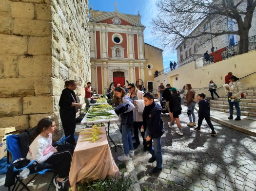 在昂蒂布,我走著走著,就看到很多人手持花束,來來往往的行人手中也拿著一束樹枝,或者某種植物枝葉做成的小工藝品,當地居民自行車上也別著橄欖樹枝和棕櫚樹葉。