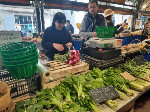 其實在昂蒂布,每週末都有個著名的普羅旺斯集市。集市分為兩部分,一部分出售手工藝品,生活用品,衣服鞋子袋子籃子等,一部分則是食品,蔬菜,水果,小吃。不知是否是棕枝主日的緣故,這裡旅遊者眾多;集市上還有不少賣花的攤點,更為新奇的是,這裡賣蔬菜的人也同時賣花,一束花的價格在3到10歐,非常便宜,要知道,在這個富豪雲集,物價相對高昂的蔚藍海岸地區,這種花價簡直是在做慈善。(摩納哥同樣的花束價格在30歐左右)。後來知道,在法國南部,棕枝主日不但叫作棕櫚樹星期日,還叫做花朵復活節,這一天,人們要拿著花朵和樹枝去教堂。