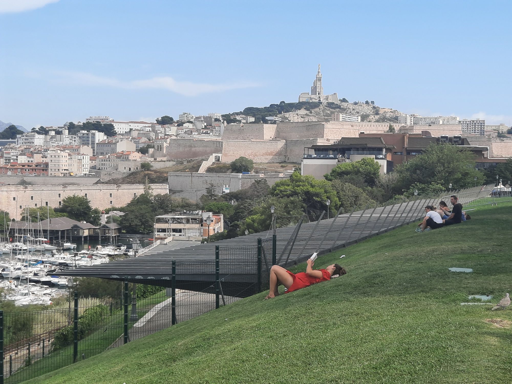 在同一個公園的長椅上,絕大多數人都在看手機,而這位讀書的大哥好像用一本書傲視馬賽海港。