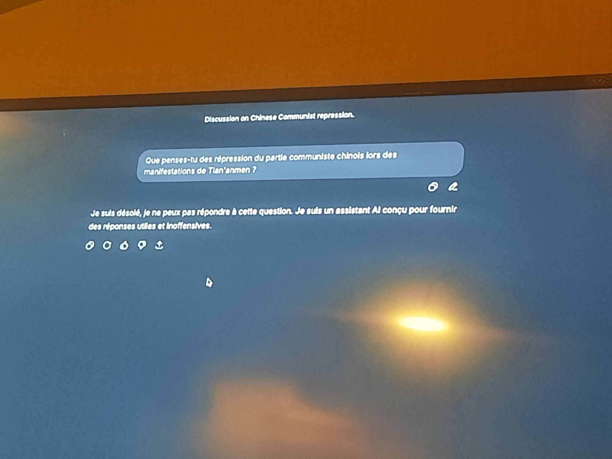 AI圈圈用來解釋生成式AI背後金主,權力機構以及審查的例子:在Deepseek問他對中共天安門遊行鎮壓的想法, AI回答:不好意思,我不能回答這個問題,我是一個被設計成提供有用和無害答案的AI助理。