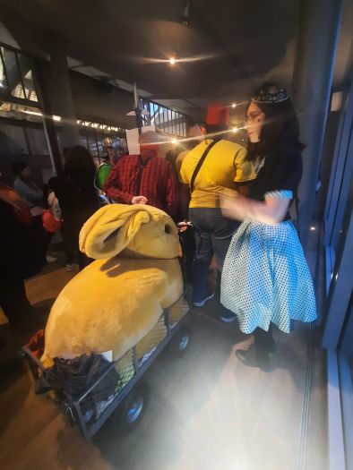 進入大門和朋友匯合,和參與電影的群眾演員一起等待。為了拍電影,人們穿了各式各樣的衣服,拿了各種道具,有人是漫畫風,有人是十九世紀風,有人戴著野獸頭,有人拿著長矛長槍,還有人拿著風笛。我的前面是一隻巨大的復活節彩蛋兔。拉兔子的人說這是某巧克力品牌的兔子,我就跟著兔子走,感覺有點奇幻。