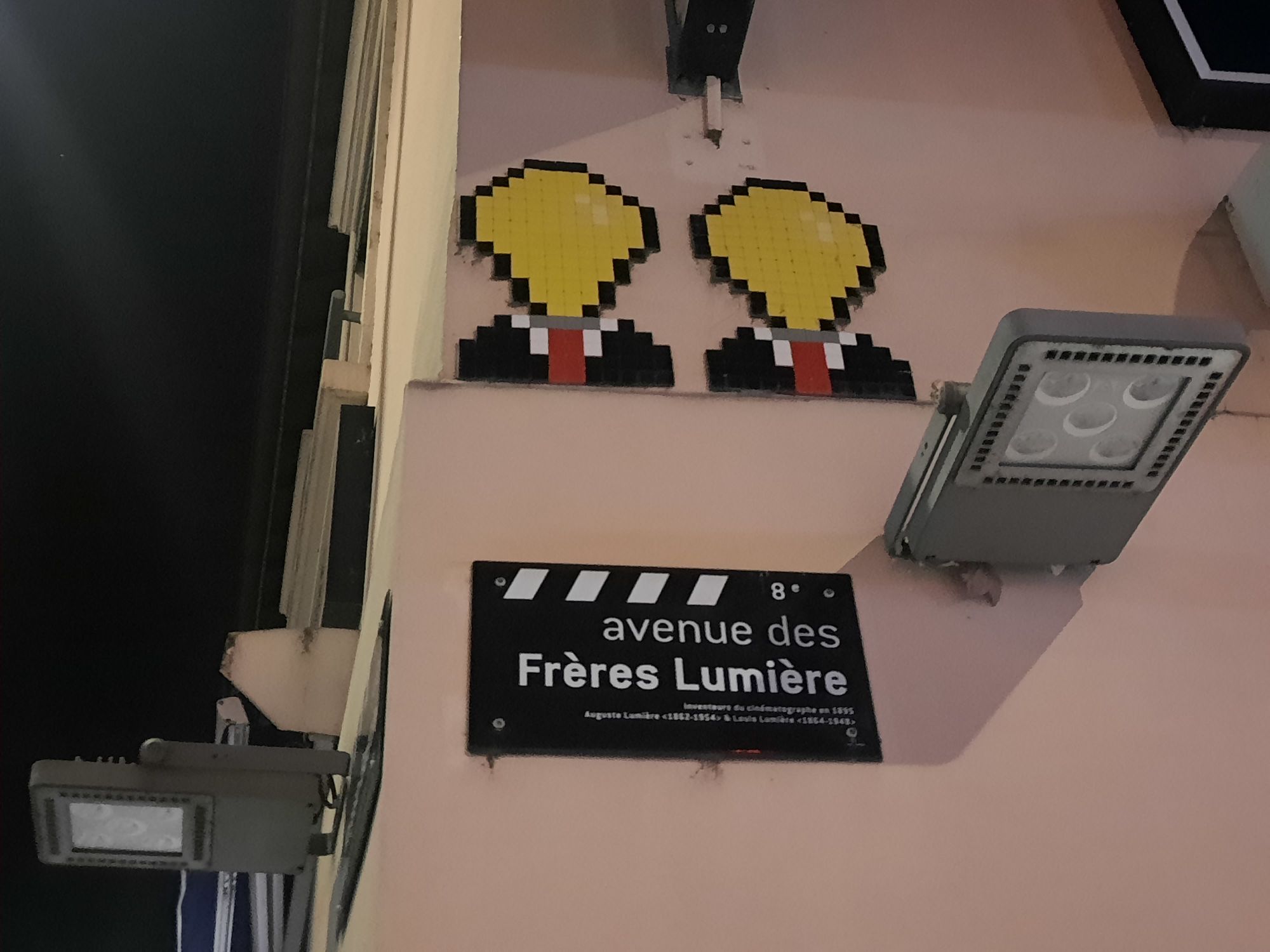 在電影博物館所在的街區,有很多地方都以盧米埃爾命名,比如廣場附近有盧米埃爾兄弟大道。路牌也是電影牌,上面被當代街頭藝術家貼上了兩個西裝電燈泡人的馬賽克圖像。盧米埃爾兄弟在法文意思中為光明兄弟,因此藝術家用電燈泡來代表他們。